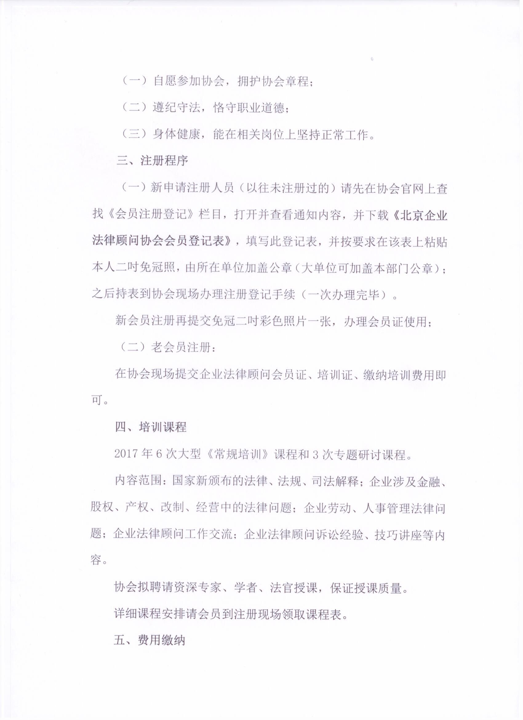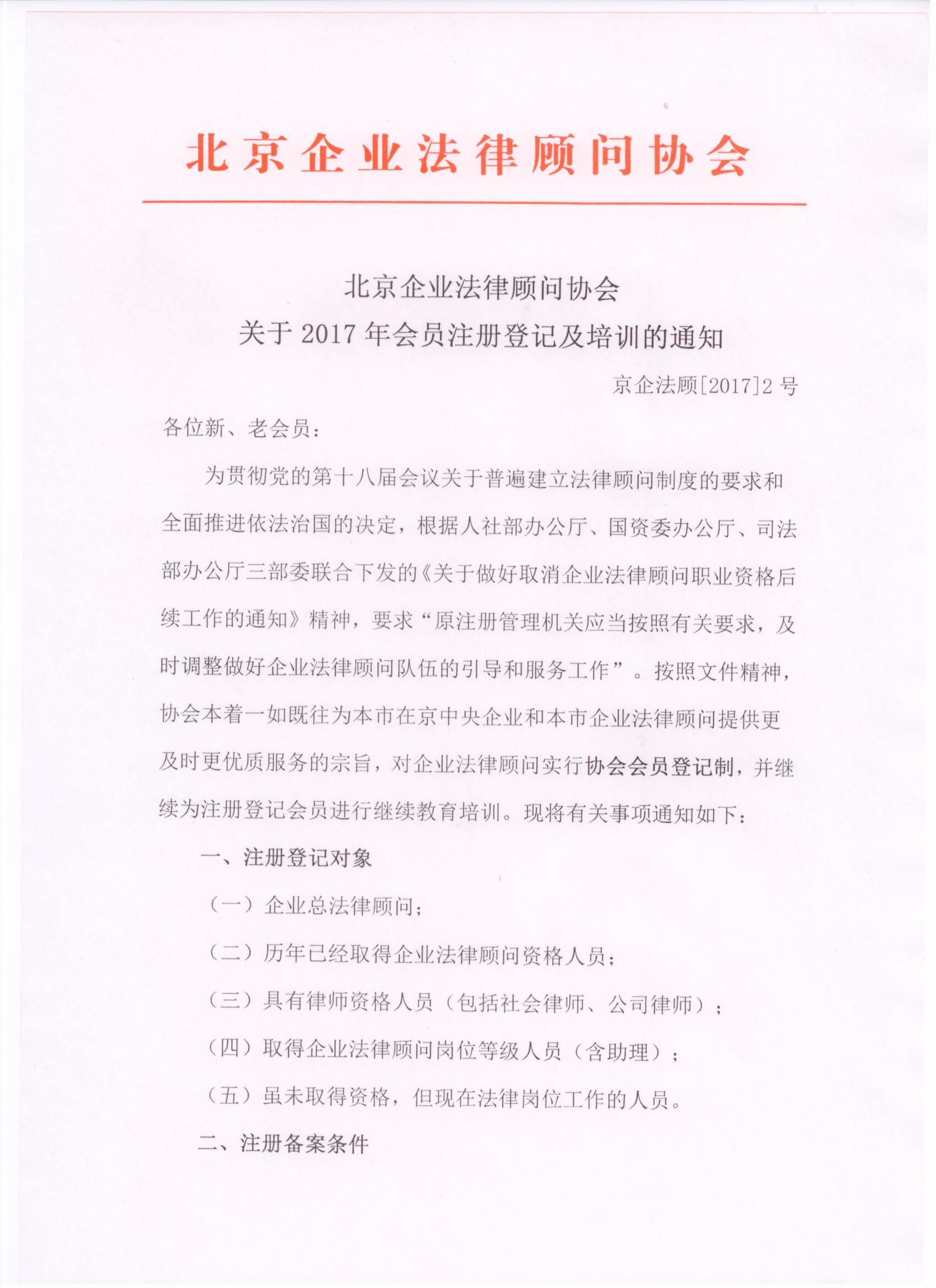为贯彻党的第十八届会议关于普遍建立法律顾问制度的要求和全面推进依法治国的决定,根据人社部办公厅、国资委办公厅、司法部办公厅三部委联合下发的《关于做好取消企业法律顾问职业资格后续工作的通知》精神,要求“原注册管理机关应当按照有关要求,及时调整做好企业法律顾问队伍的引导和服务工作”。按照文件精神,协会本着一如既往为本市在京中央企业和本市企业法律顾问提供更及时更优质服务的宗旨,对企业法律顾问实行协会会员登记制,并继续为注册登记会员进行继续教育培训。现将有关事项通知如下: